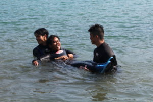 海での救助方法や、水中での介護実技の講習です。
